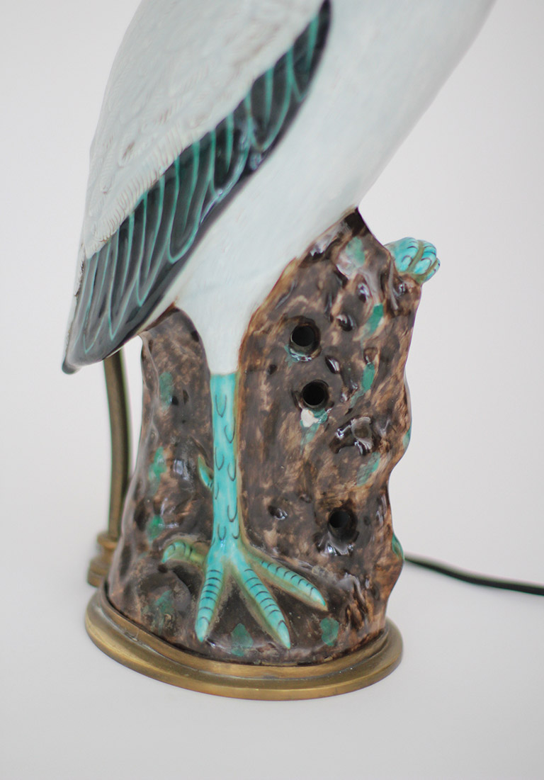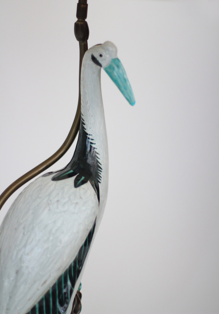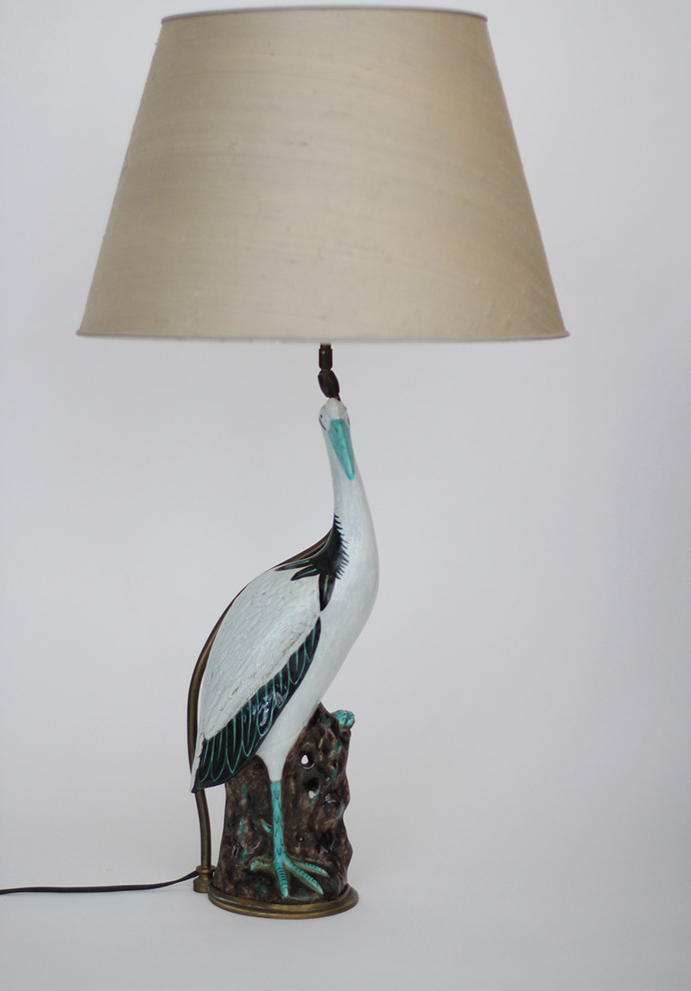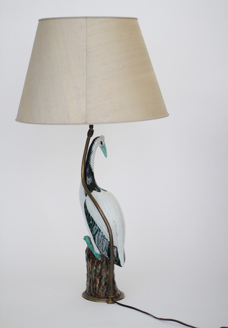 Early-to-mid-20th century Chinese porcelain white-glazed figure of a crane mounted on a bronze base table lamp. The crane could be older than the lamp as the base has been custom made to fit the crane. Comes with the original shade.