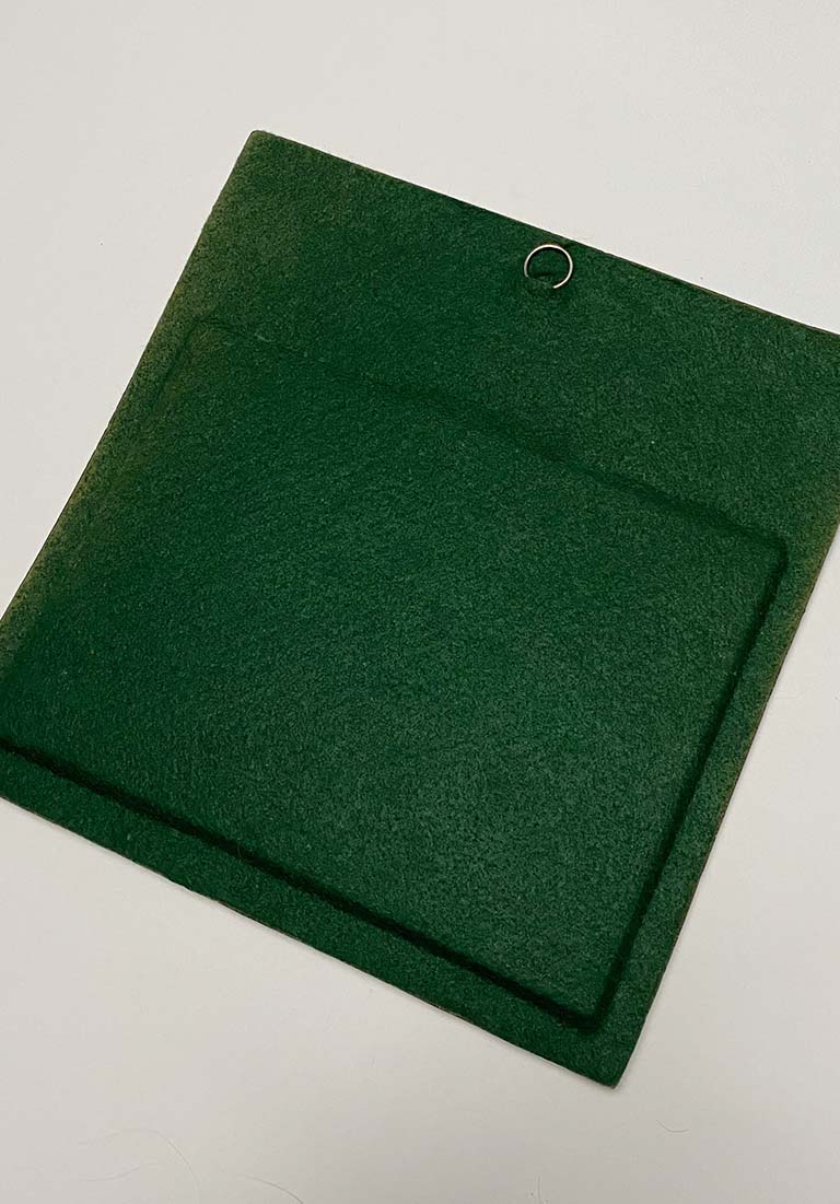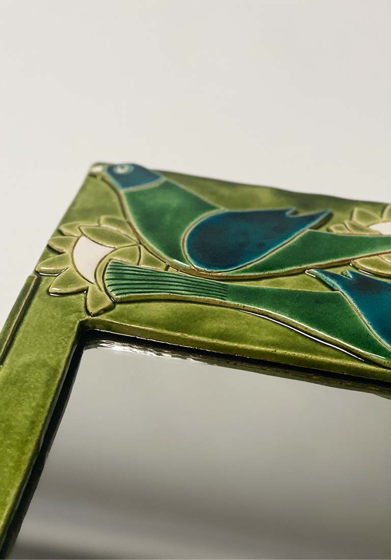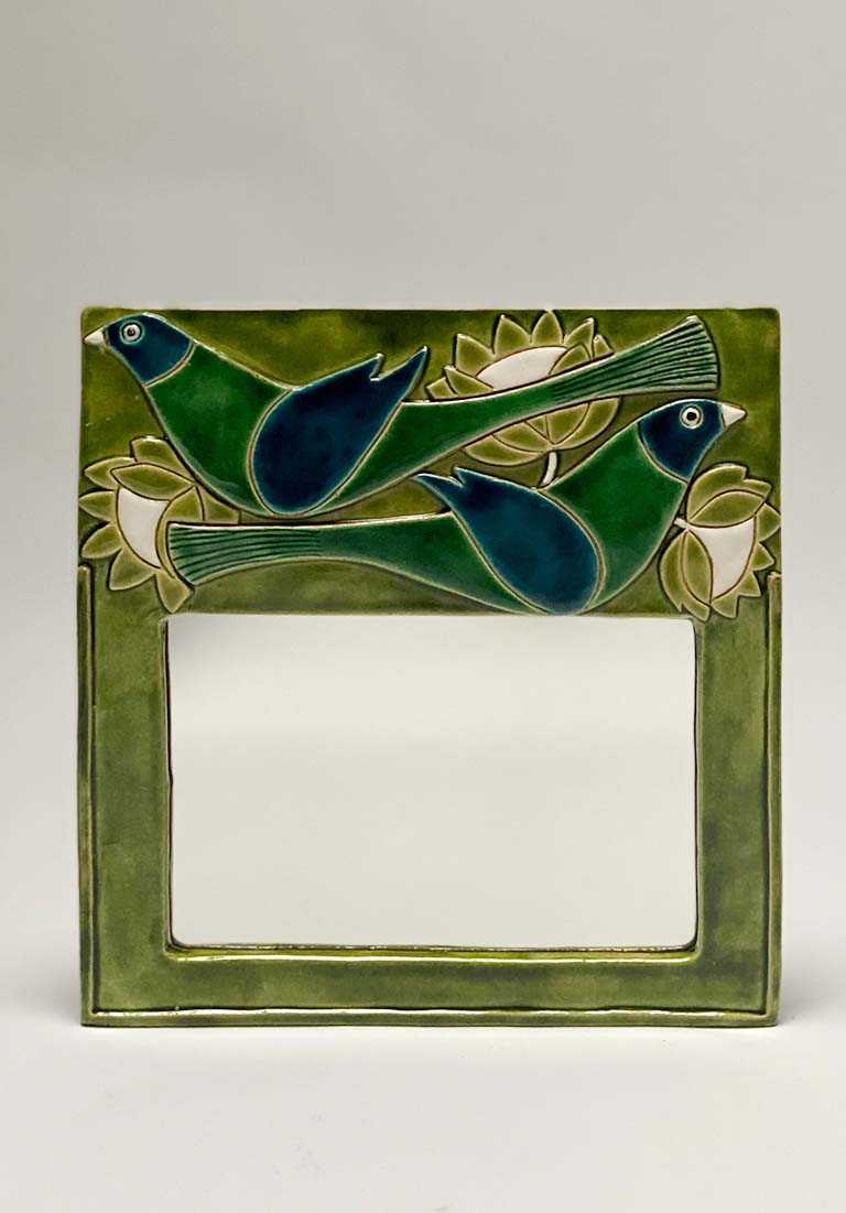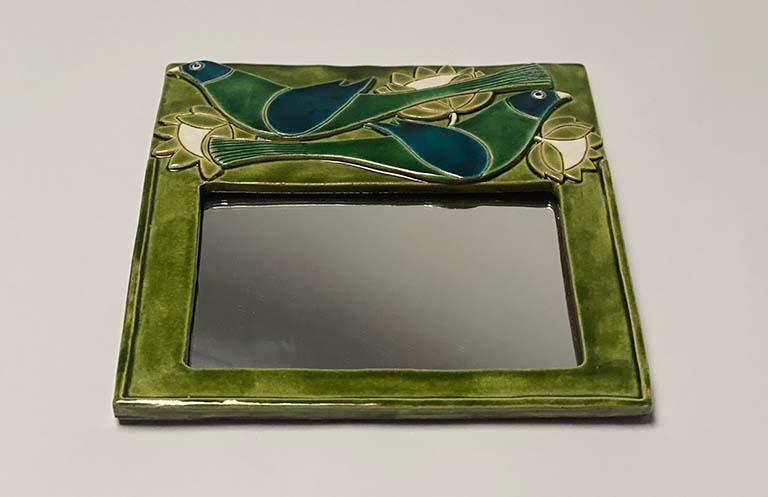 A highly desirable ceramic mirror with bird and lotus flower motif by Mithé Espelt. Original green felt at the back.
