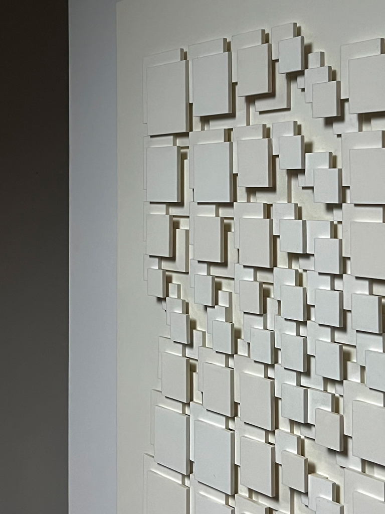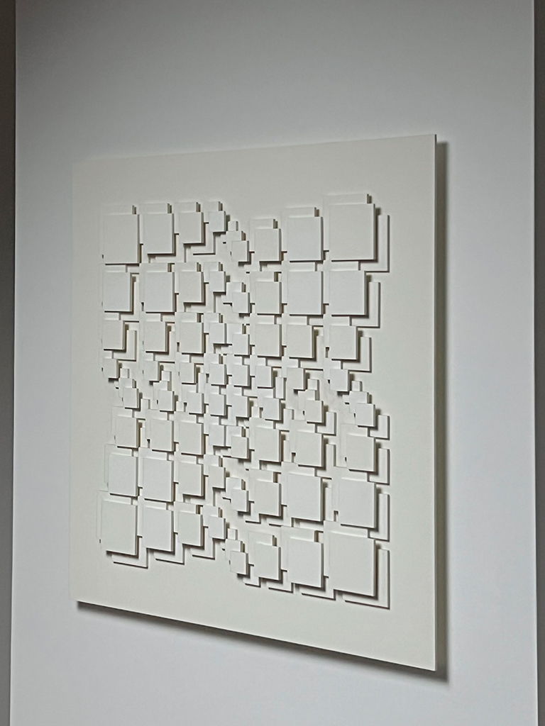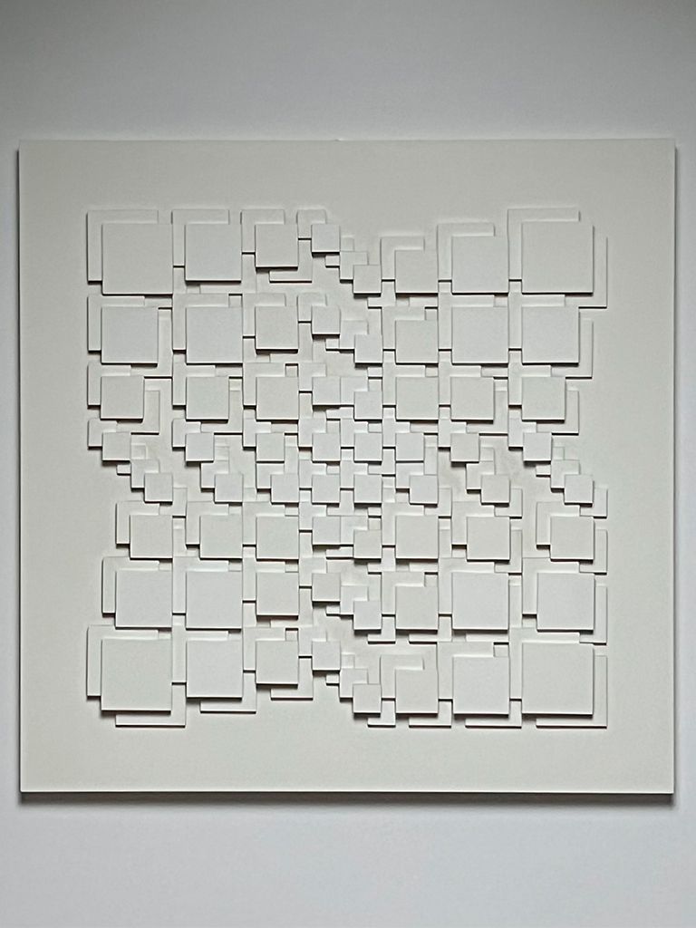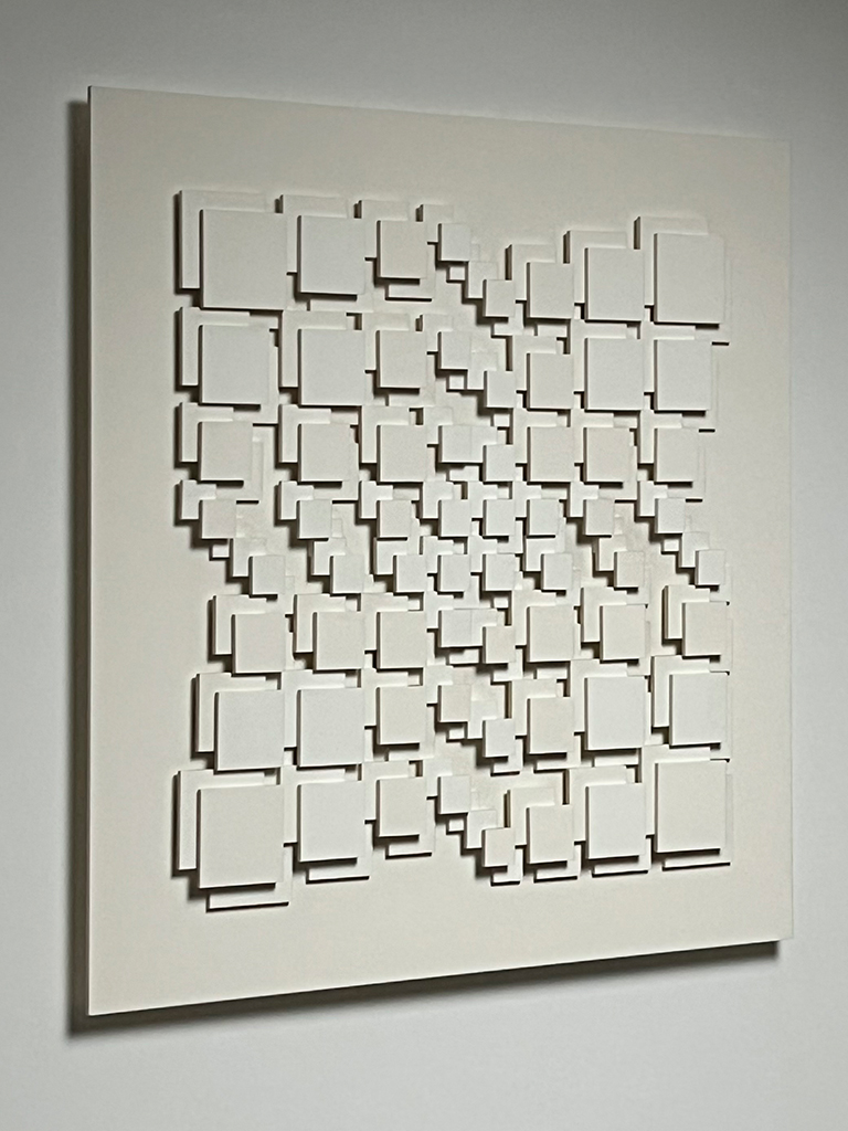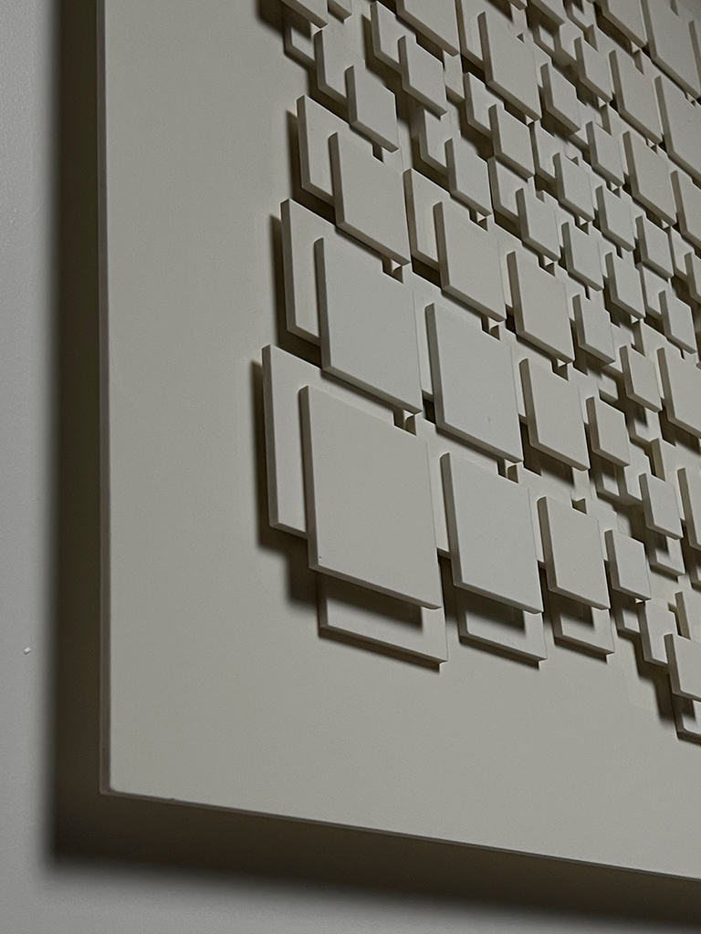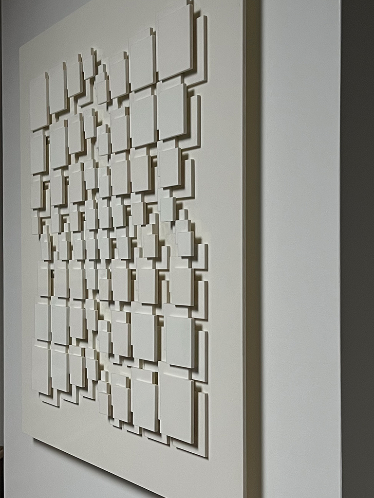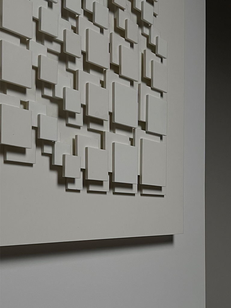 The relief’s monochromatic design features a grid of raised square elements, creating dynamic shifts in optical perception through the interaction of light, shadow, and depth. The use of Plexiglas enhances the reflective qualities of the work, turning it into an immersive, spatial experience that changes depending on the viewer’s perspective. Schrader’s minimalist approach emphasizes clarity, with the precise arrangement of forms reflecting his commitment to the formal and intellectual aspects of art.