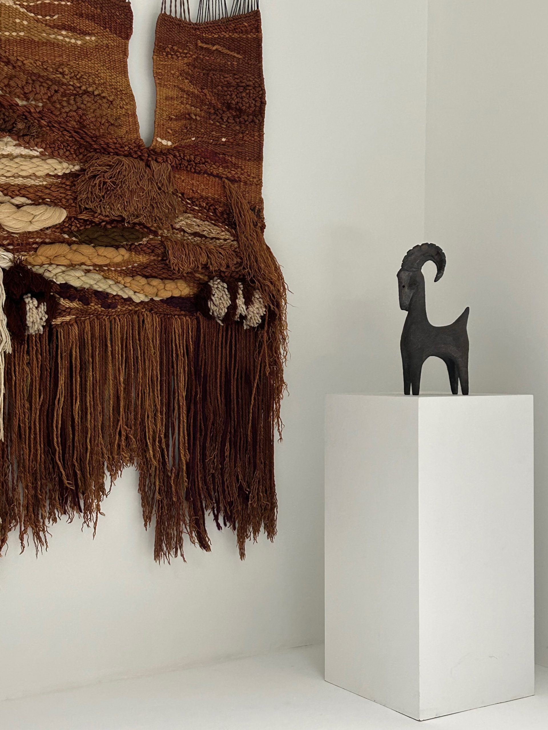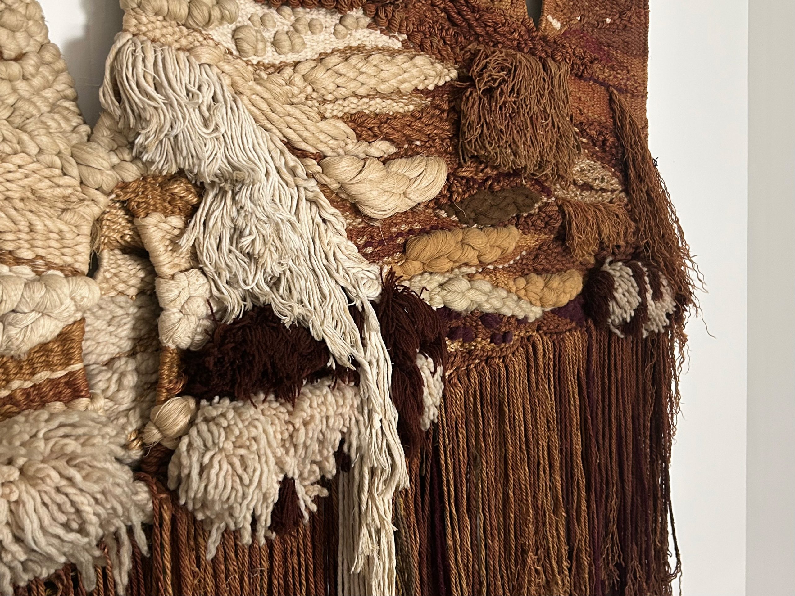 A large-scale macramé wall tapestry by Maria Asuncion Raventos, defined by its layered composition and tactile depth.