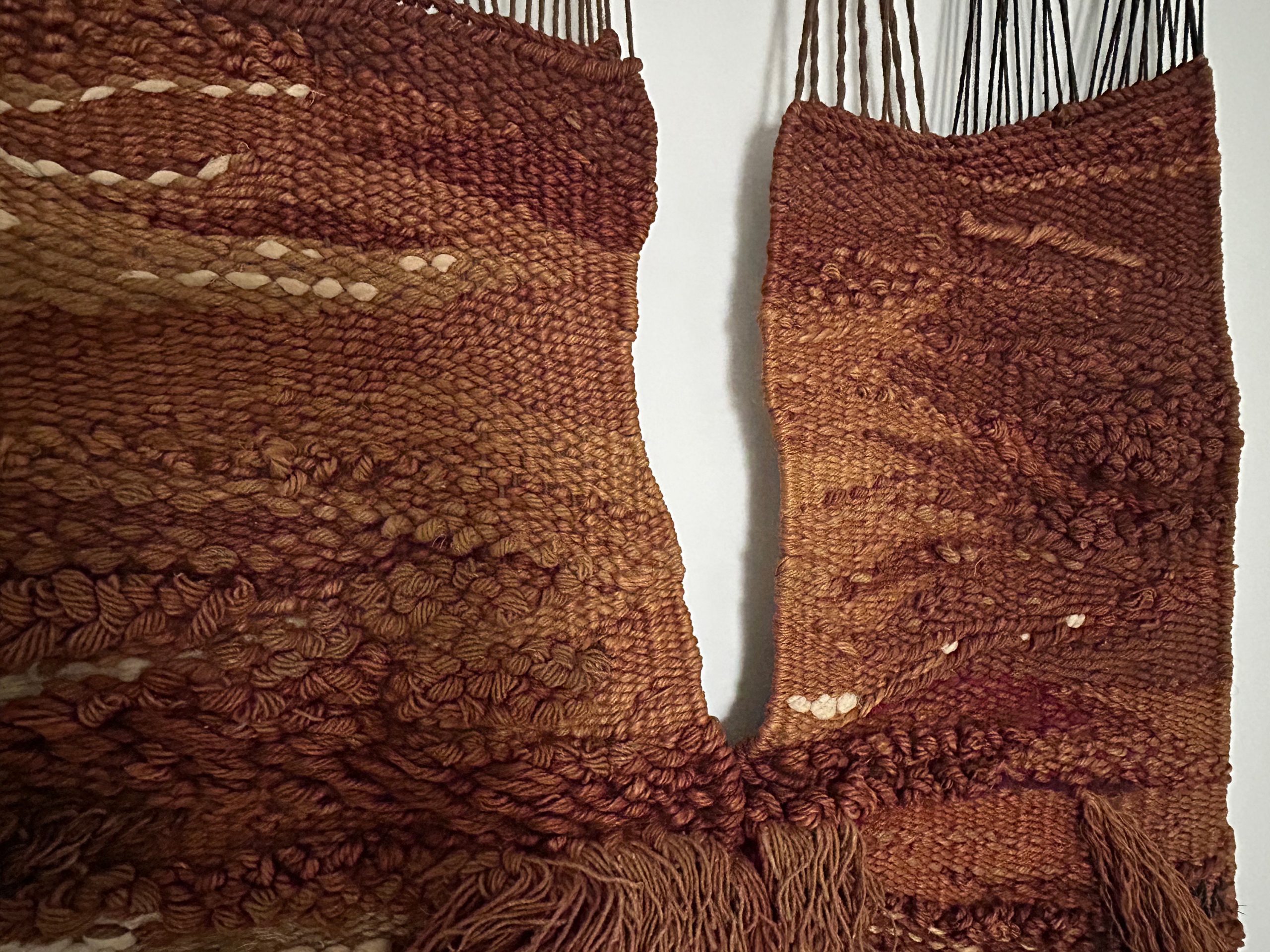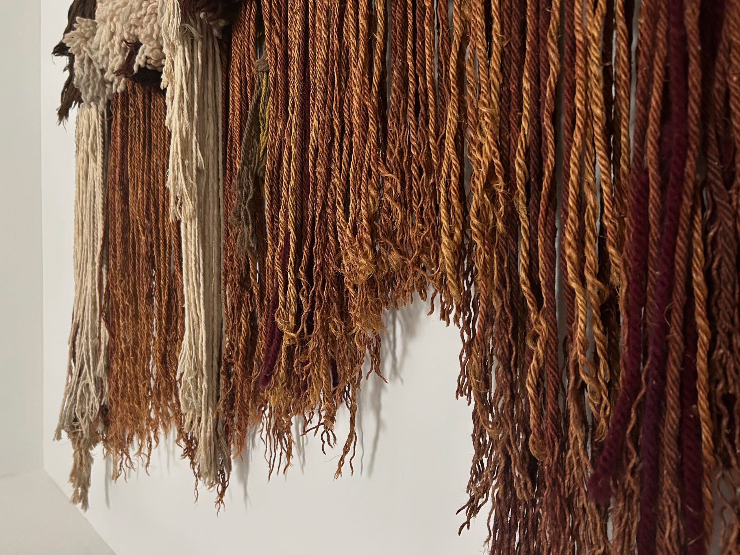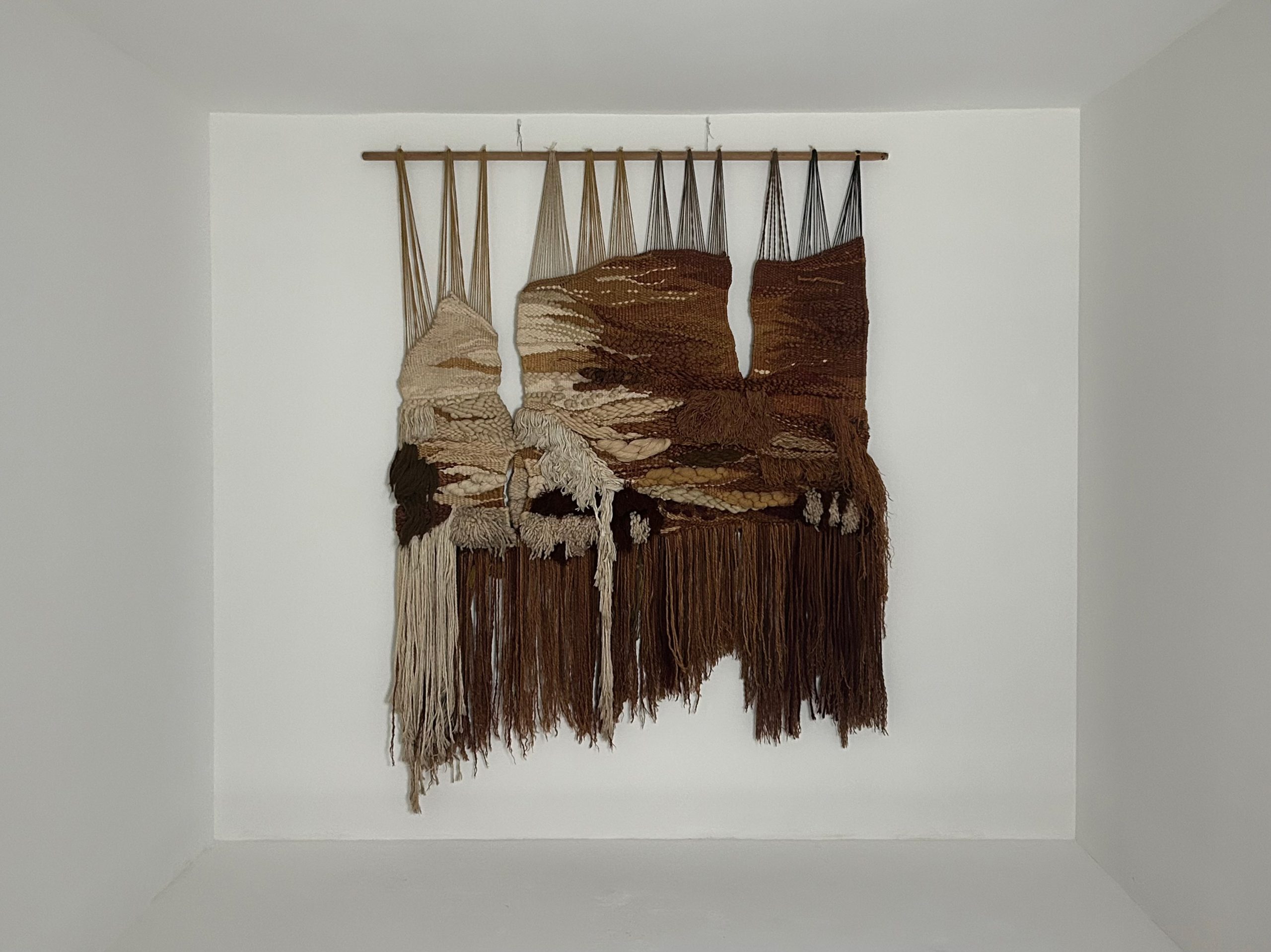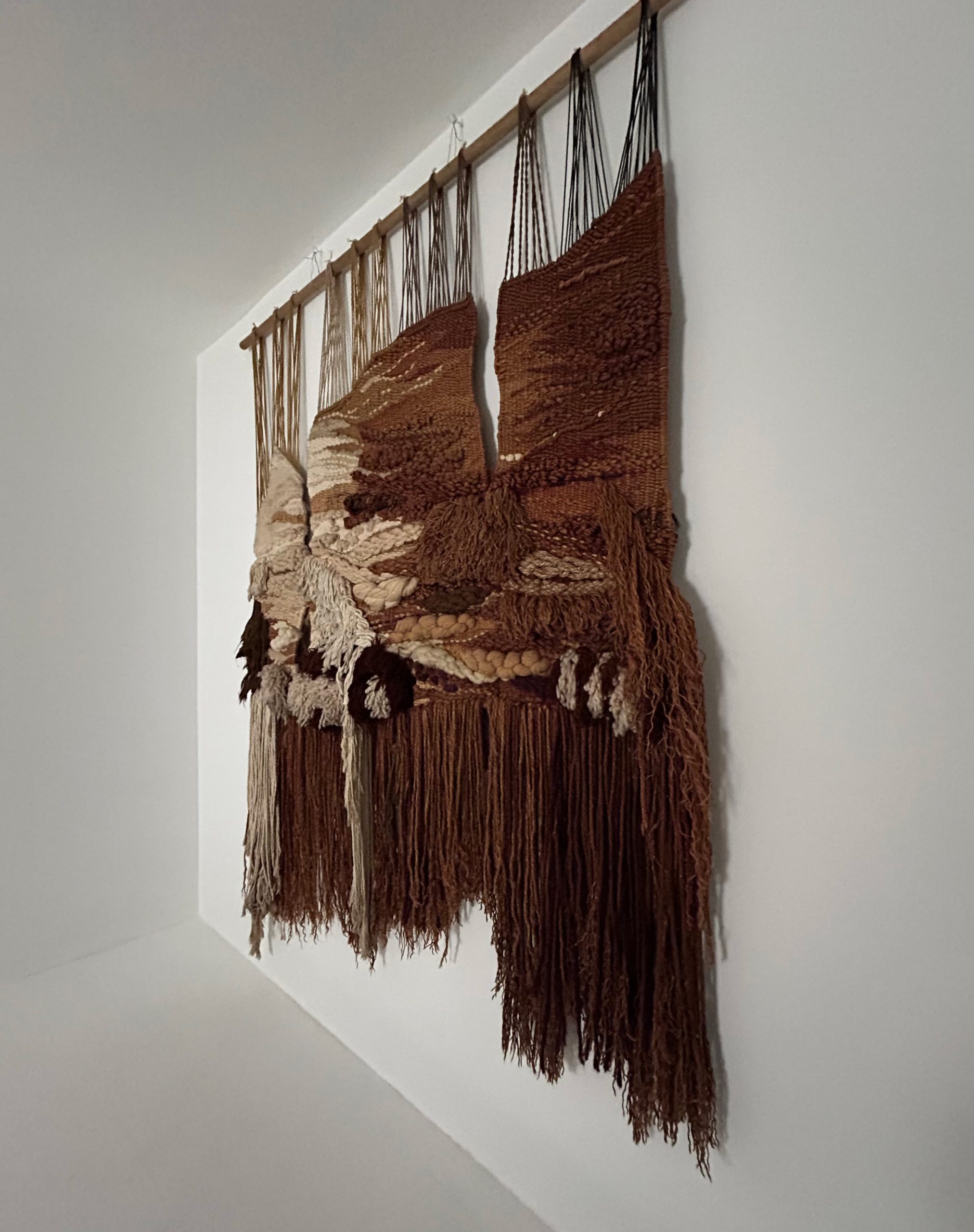 The composition is structured in vertical sections, suspended from a wooden rod. Long cascading fringes extend the form downward, giving the piece a sense of movement and weight.